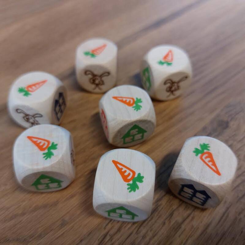- 7 dobbelstenen met konijnen, hokken, en een wortel